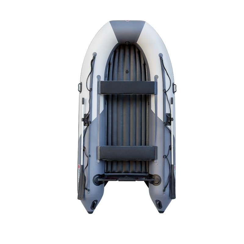 Надувное V-образное дно моторных лодок Юкона серии НДНД образованное комплектом продольных переборок и вклеенная в корпус надувной лодки, обеспечивает необходимую жесткость днища и минимальное гидродинамическое сопротивление, высокие скоростные характеристики. Это позволяют моторной лодке размером 300,320,340,350,380 быстро выходить на глиссирование с лодочным мотором мощность от 10 л.с.